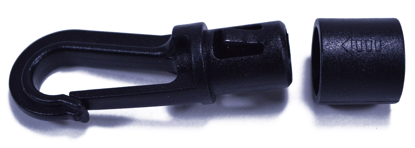 Our shock cord bungee end hooks are tough. They are designed to fit a 1/4" inch diameter shock cord. These hooks are suitable for uses involving extreme weather, high temperatures, and any other element mother nature can throw at it. These shock cord fasteners are rust and corrosion-proof, light and durable, and very strong.